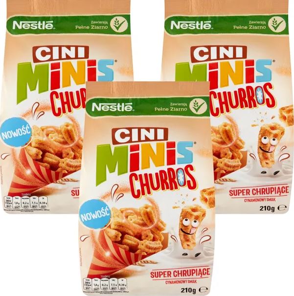 NESTLE CINI MINIS CHURROS- płatki śniadaniowe o smaku cynamonowym, z witaminami i żelazem. Wyróżniają się oryginalnym kształtem, inspirowanym słynnym hiszpańskim przysmakiem – churros.