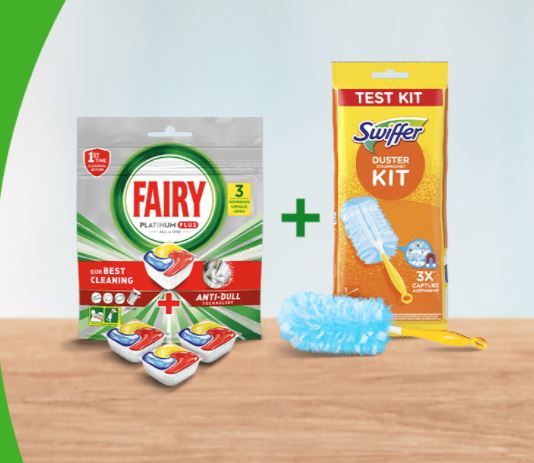 Oczekuj przesyłki z zestawem Swiffer Duster i kapsułkami Fairy Platinum Plus (3 tabletki)