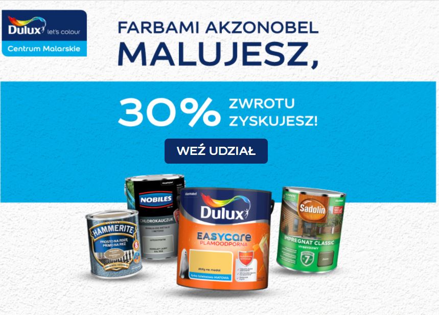 W sieci Centrów Malarskich Dulux od 01.09. do 30.09.2021 lub do wyczerpania regulaminowej puli zwrotów (w zależności od tego, które ze zdarzeń nastąpi jako pierwsze) będzie trwała akcja „Farbami AkzoNobel malujesz, 30% zwrotu zyskujesz!”.