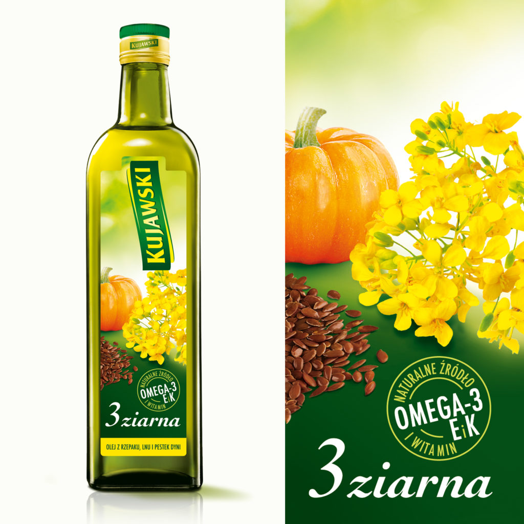OLEJ KUJAWSKI 3 ZIARNA - olej rzepakowy wzbogacony olejem lnianym i olejem z pestek dyni.